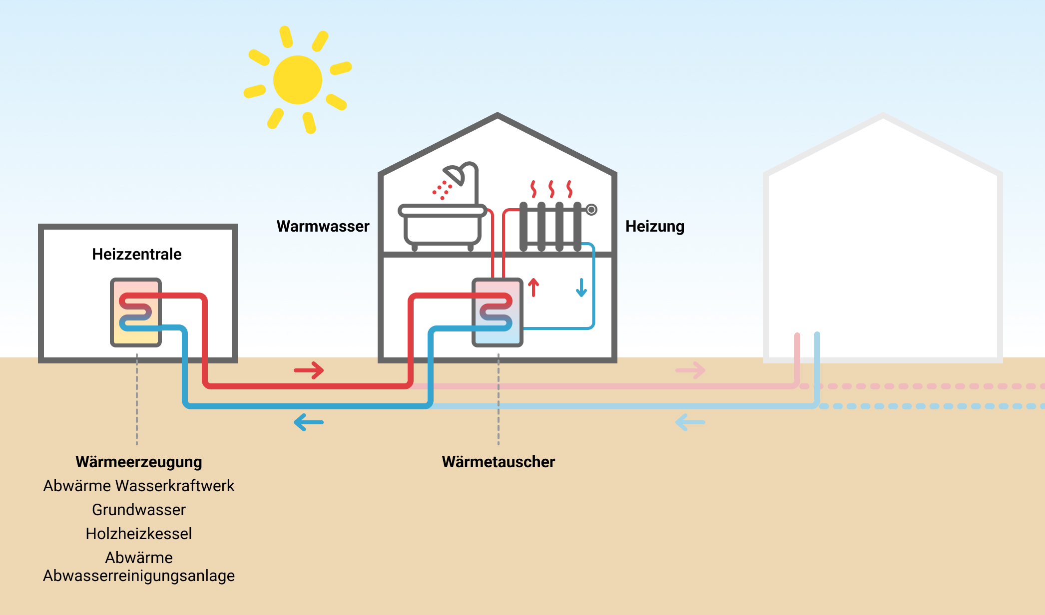 In Fernwärmeverbünden wird Energie zentral produziert und über Leitungen an angeschlossene Liegenschaften geliefert. Als Trägermedium für die Wärme wird in den Leitungen meist Wasser verwendet. In der Liegenschaft wird die Wärme mit einer Übergabestation abgenommen und fürs Heizen und Warmwasser innerhalb der Liegenschaft über das eigene Sekundärnetz verteilt. Die Übergabestation regelt selbstständig, wie viel Wärme die Liegenschaft braucht. Das erkaltete Wasser wird anschliessend wieder zurückgegeben und zur Wärmezentrale des Fernwärmeverbundes zurückgeleitet.